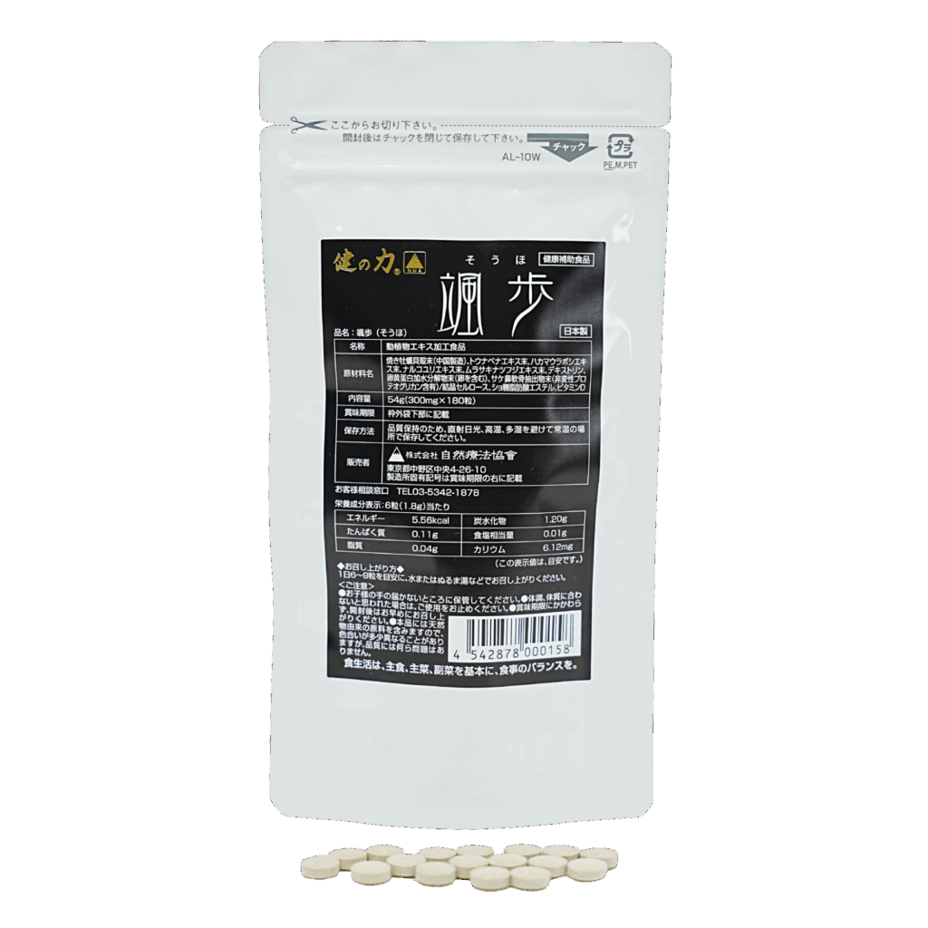 | 原材料名 | 焼き牡蠣貝殻末(中国製造)、トウナベナエキス末、ハナマワラボエキス末、ナルコユリエキス末、ムラサキナツヅエキス末、デキストリン、卵黄蛋白加水分解物(卵を含む)、サケ鼻軟骨抽出物(非変性プロテオグリカン含有)/結晶セルロース、ショ糖脂肪酸エステル、ビタミンD |
